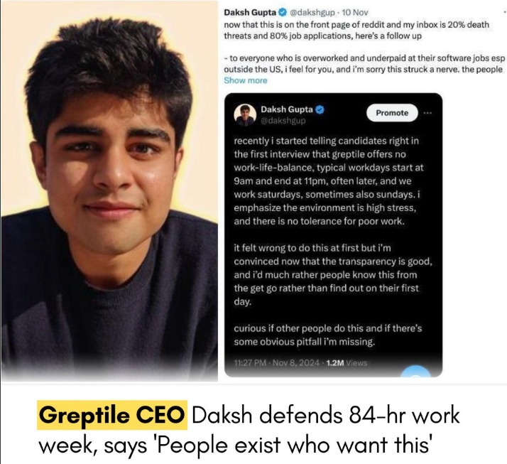 In India Inc., the 12-hour workday is practically a rite of passage; a badge of honor brandished from Bangalore boardrooms to Mumbai trading floors. Overworked founders and managers now boast about mandatory 10 am–10 pm schedules six days a week, and some even crow about having “no work-life balance” (the CEO of one AI startup posted that his firm’s “typical workdays start at 9 a.m. and end at 11 p.m., including weekends”).