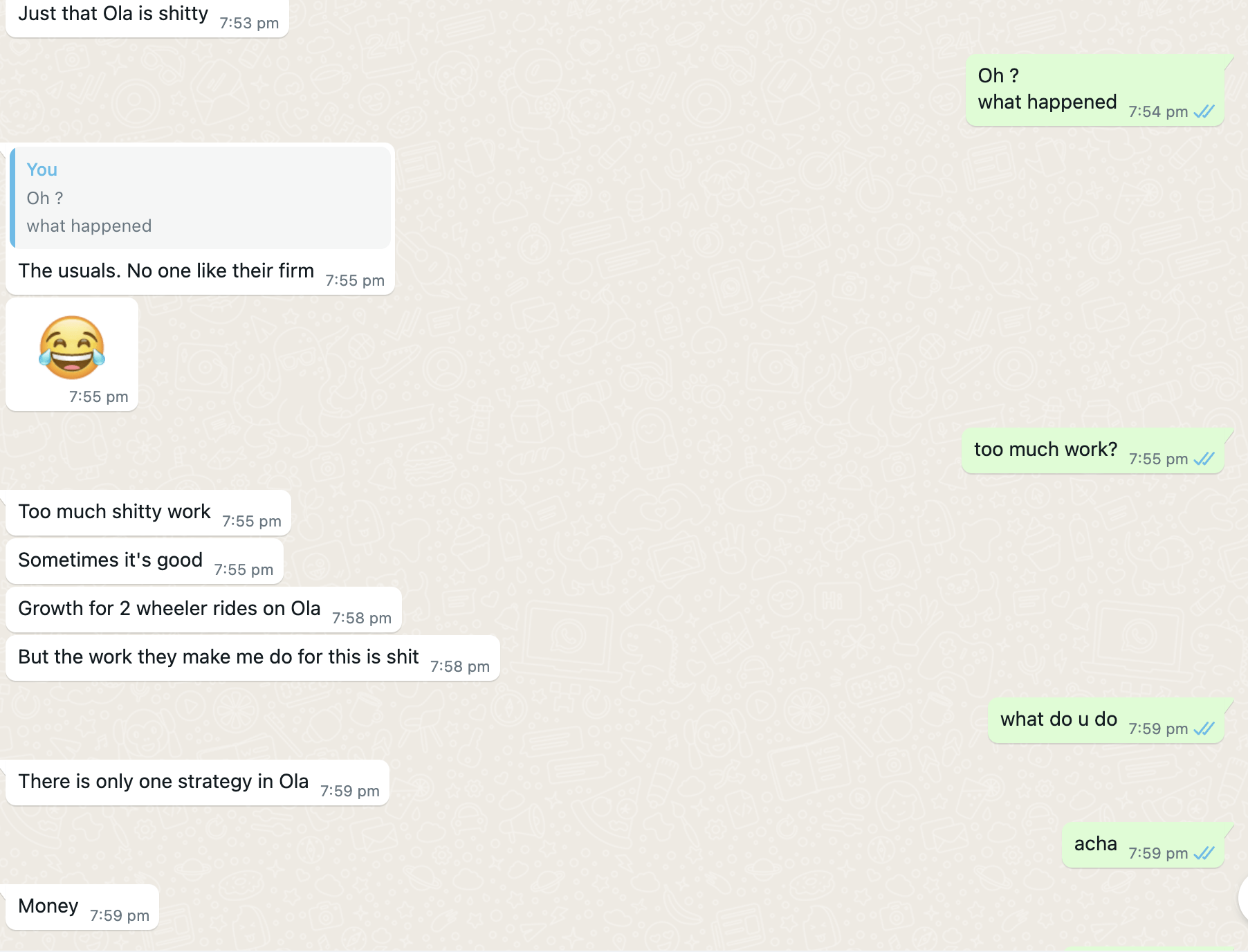 Those in the industry are aware of the toxic work culture of Ola. Many overworked and underpaid employees are not able to hold for over a year. On a personal level, I have four friends working there, one of whom recently opened up about the work culture. While the majority of the conversation took place on voice call, this chat snippet should tell you enough.