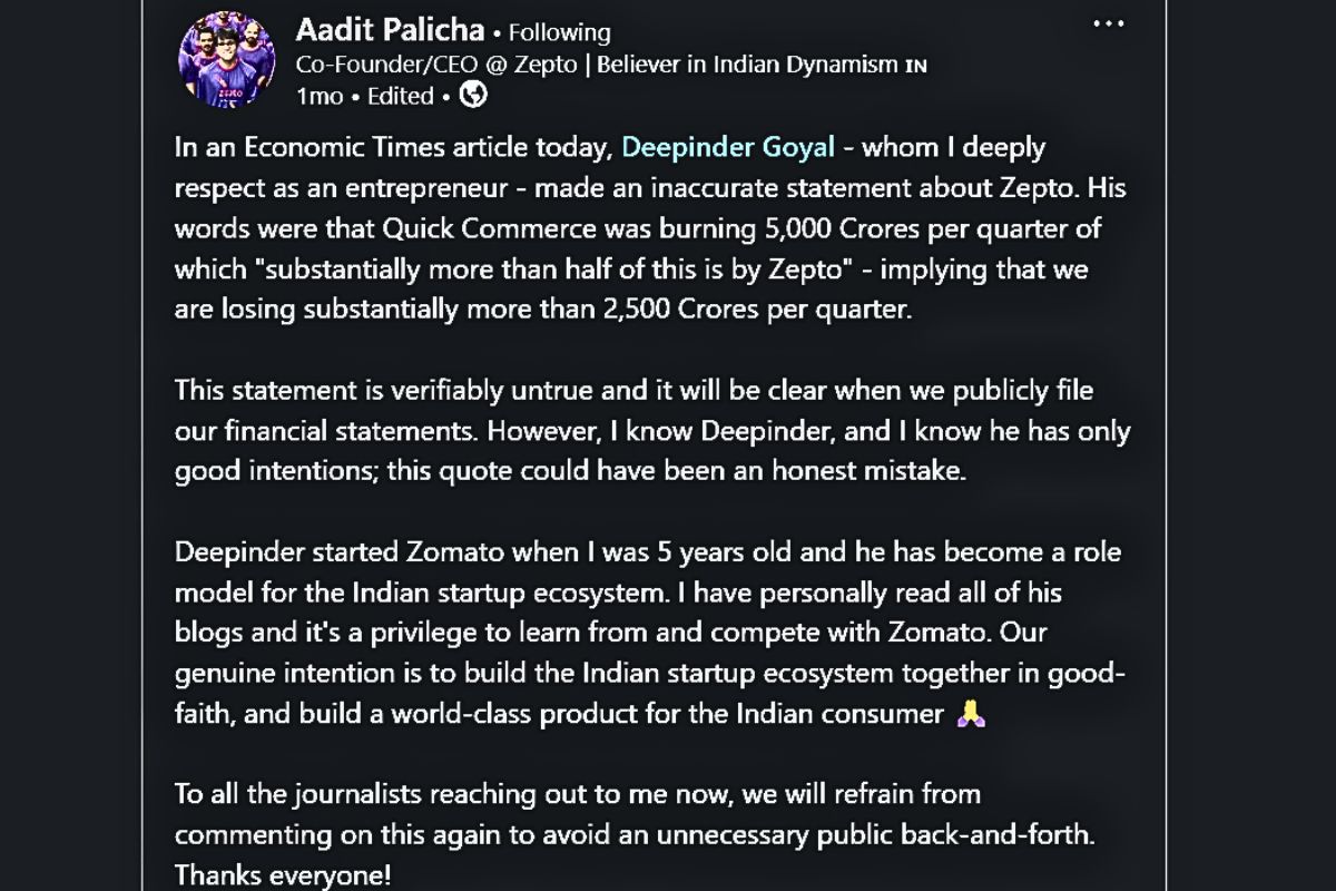 Another troubling aspect of the Zomato situation is the way that CEO Deepinder Goyal spoke about cash burn at the company. Few times ago, in a seminar, Mr. Goyal said that Zomato loses money at a much lower rate than competitor Zepto – something that Zepto founder Mr. Palicha publicly, yet respectfully, criticised. This style of speaking is fascinating to analyze because it uses what some call a “tu quoque” argument – essentially saying “but they are worse” instead of directly confronting the accusations. As Mark Twain once said, “When in doubt, tell the truth” – this principle suggests that confronting concerns directly instead of deflecting attention might be better for sustaining stakeholder trust.