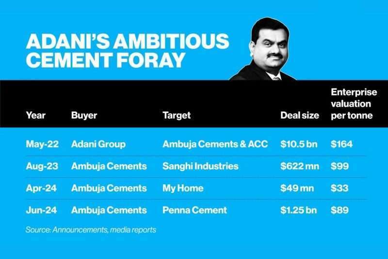 In 2022, the Adani Group joined the cement market by acquiring assets from Ambuja Cements and ACC. It helped the group become the second-largest cement firm in India, with market share of 14% and a capacity of 79 MPTA (millions of tonnes per year). The latest acquisition, Penna Cement, will expand capacity to 89 MTPA. According to Ambuja’s filing, the Adani Group expects an installed capacity of 100 MTPA by 2026 and 140 MTPA by 2028.