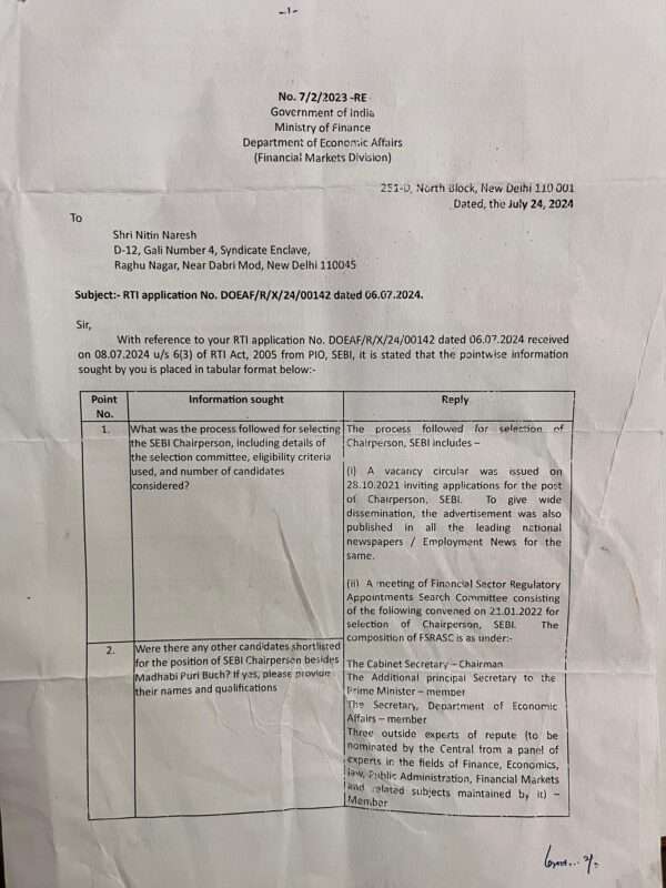 The response from the Ministry of Finance, Government of India, has raised significant questions about the transparency and accountability of the selection process. According to the RTI reply, the ministry does not possess any specific information or documentation detailing the qualifications, experience, or other criteria that were considered when Madhabi Puri Buch was appointed as the Chairman of SEBI.
