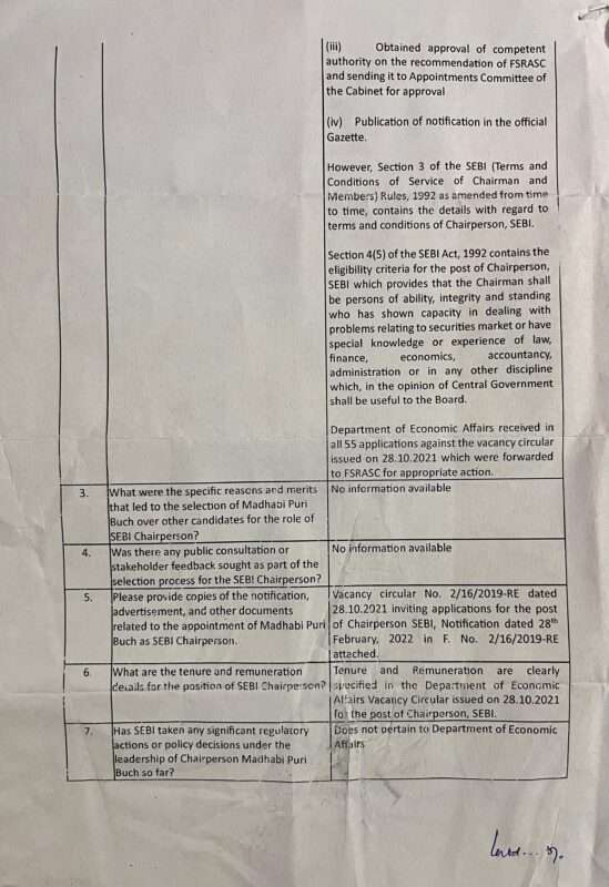 As Per RTI Records Ministry Of Finance, Government Of India Has No Information About Why & How Madhabi Puri Buch Was Made The Chairman Of SEBI