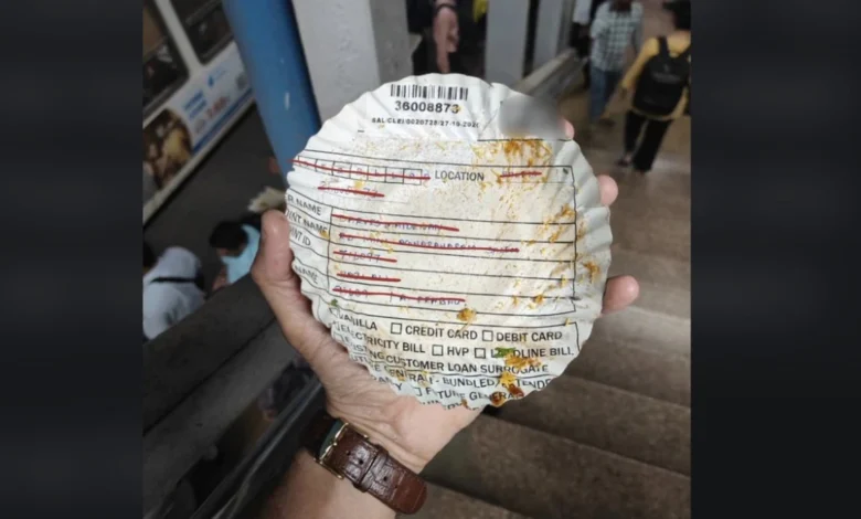 The image, shared on X by an account shows a roadside food plate allegedly fashioned from a discarded bank or financial document. The paper plate appears to still carry printed customer information, including fields showing names, locations, and payment-related details. Although some portions are scribbled out, several entries remain clearly legible.