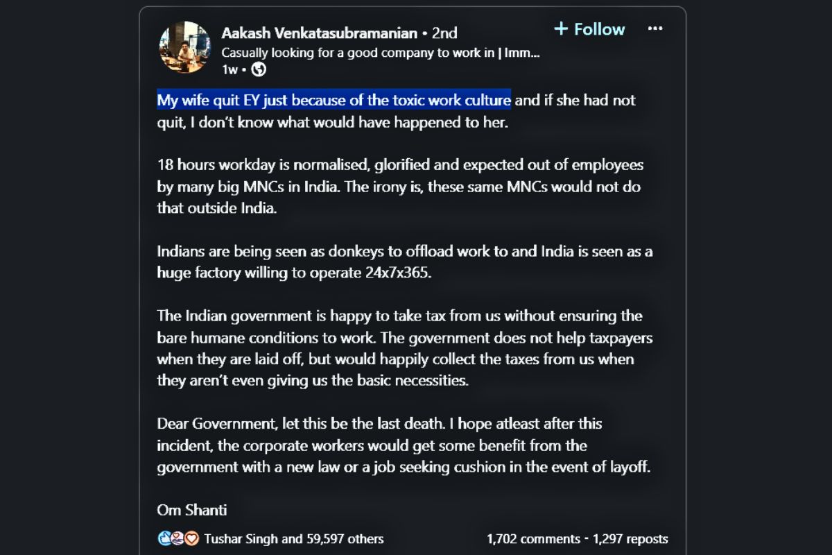 The departed CA Anna is not the only one who suffered such a harsh work culture. Days after this incident happened, another individual, Aakash Venkatasubramanian, acknowledged similar voices of unacceptable work culture. This Bengaluru techie, in a LinkedIn post, shared that his wife left EY due to the demanding 18-hour workdays that have become normalised in many multinational corporations in India. Venkatasubramanian criticised both the corporate culture and the Indian government’s lack of intervention, calling for reforms to protect workers.