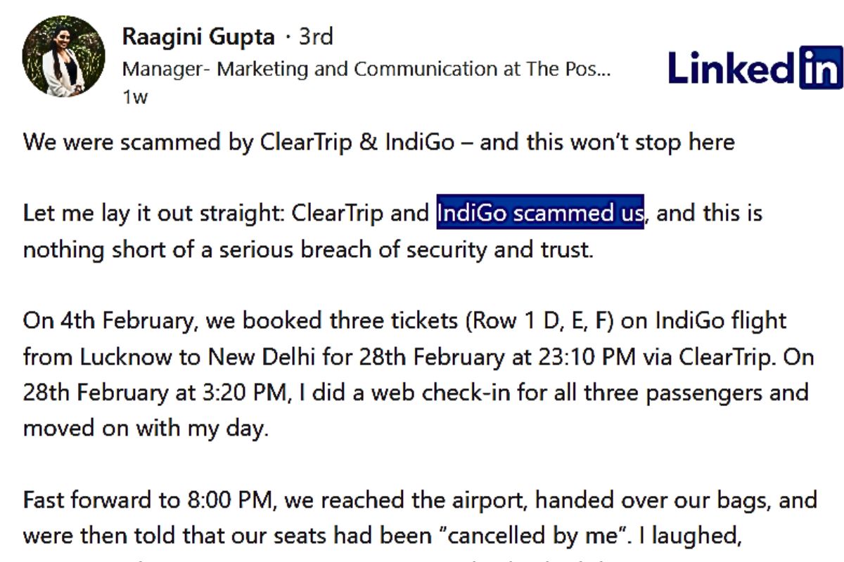 A few days ago, a LinkedIn user’s post criticizing IndiGo Airlines and Cleartrip for allegedly canceling a ticket without alerting the customers went viral. Raagini Gupta took to the networking site to criticize both businesses for her experience after booking a flight from Lucknow to New Delhi. She immediately contacted Cleartrip because the booking had been made through them. They said that IndiGo cancelled the booking.