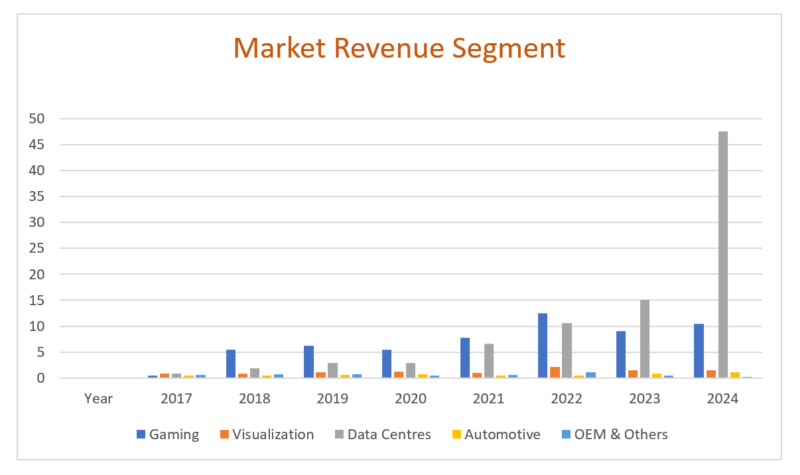 Over the years Nivida’s revenue segment has been increasing rapidly and its main revenue segment is coming from the sale of powerful chips to data centres. The other next main revenue generator is the gaming segment and that is the place the company initially started to produce graphic processors. The other segments like professional visualization, automotive and OEM also add more and more revenue segments to the growth.
