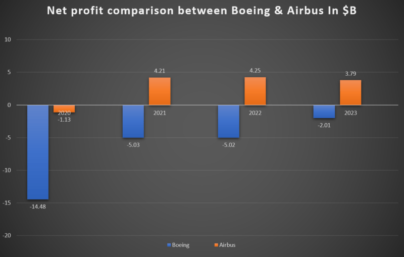 Airbus is smaller compared to Boeing but its financial books are very strong when compared to Boeing. In FY 23 airbus declared a 3.79 $ B net profit while in the same financial year, Boeing declared a net loss of 2.02 $B.