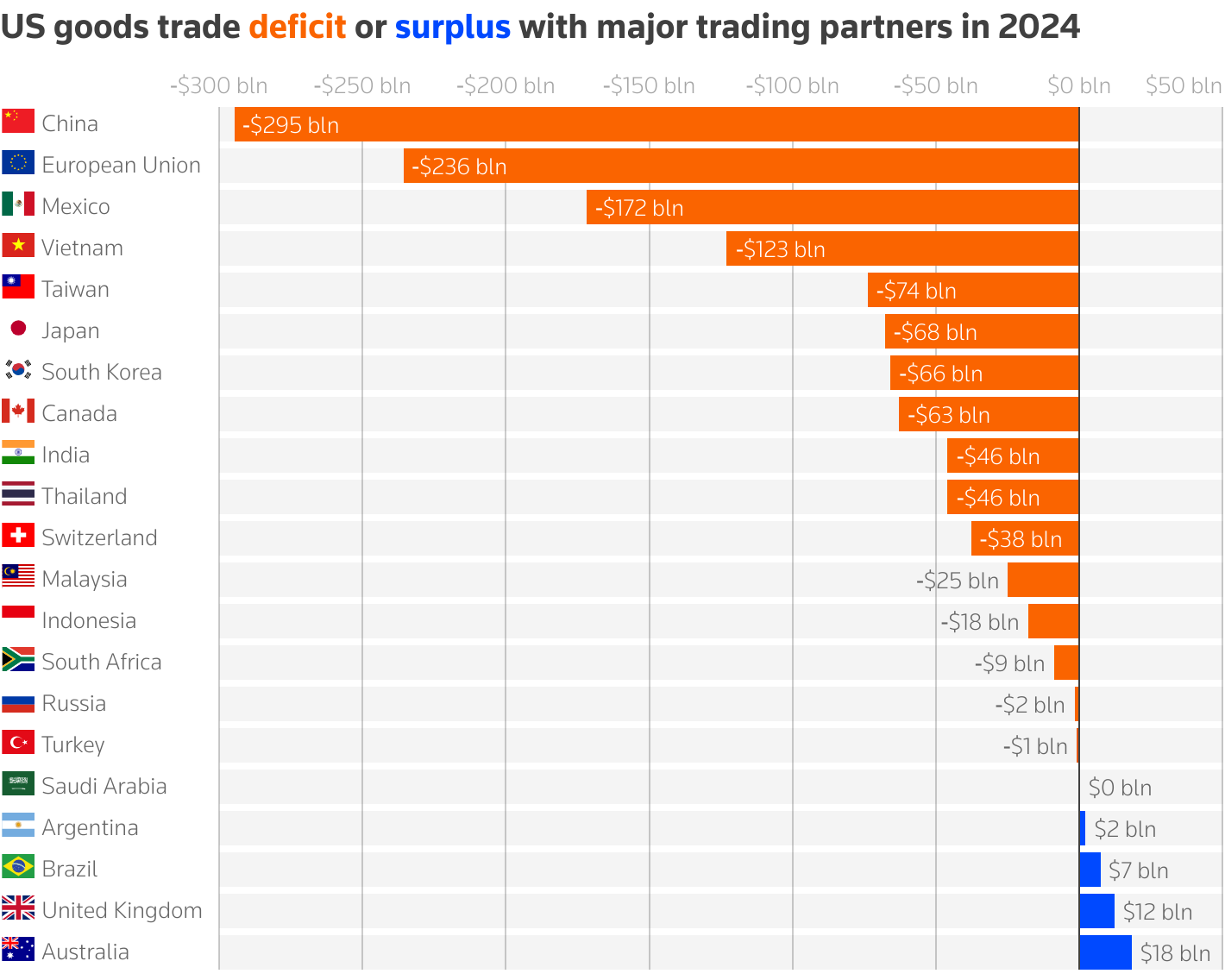 Kevin Hassett, head of Trump’s National Economic Council, revealed in an interview that 10 to 15 countries account for America’s $1 trillion trade deficit and while he didn’t name names, Commerce Department data shows that in 2024, the US had the biggest trade deficits with: