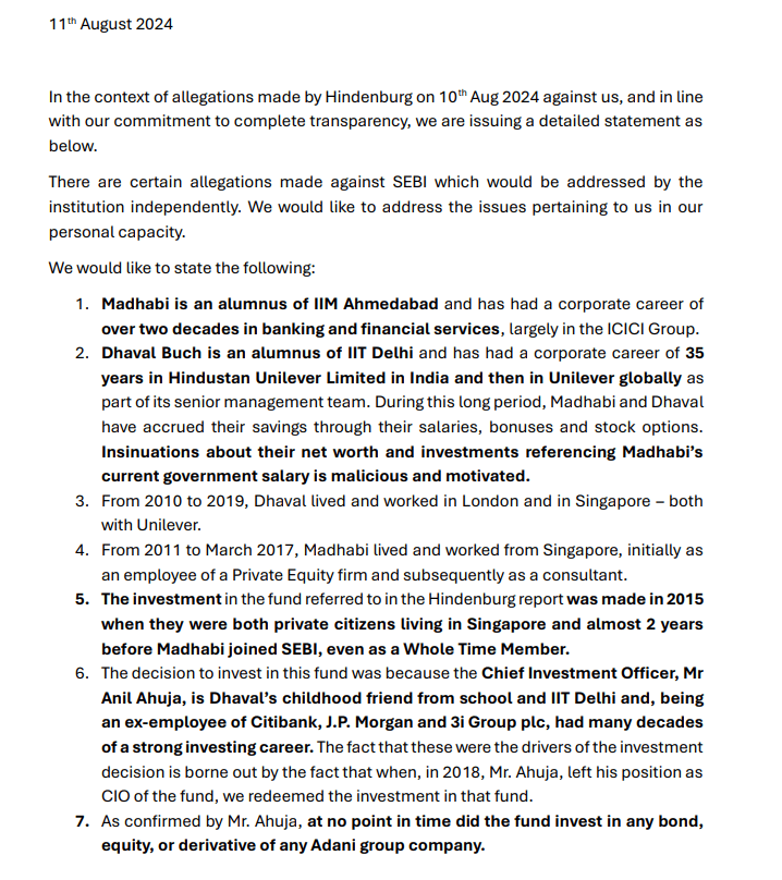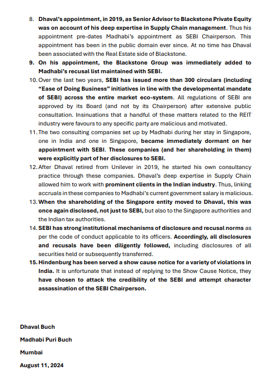 Responding to these charges, the Buchs issued a statement outlining their stance on August 11, 2024, in which they have categorically denied these allegations of impropriety. They had invested in these entities when both of them were private citizens and residents of Singapore, way before Madhabi Puri Buch joined SEBI.