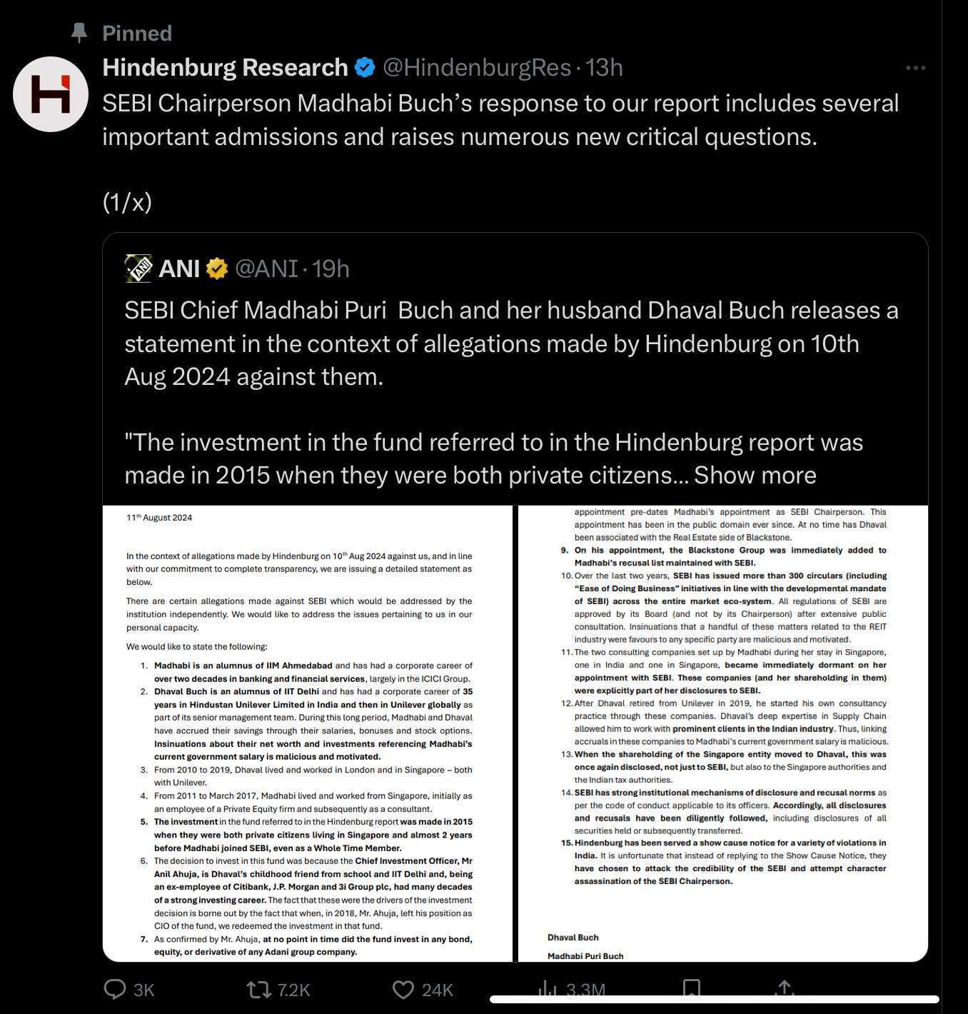 Contrary to efforts put in by the Buchs to clear their names, Hindenburg was quick to respond, pointing major inconsistencies in their defence. Hindenburg further stated that Madhabi Puri Buch’s statement confirmed her investment in a Bermuda/Mauritius fund, which Hindenburg alleges is linked to money syphoned by Vinod Adani.